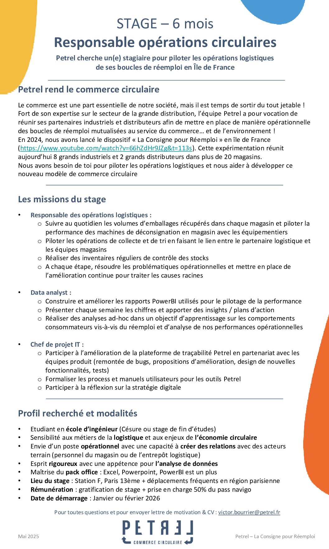 Petrel, qui rend le commerce circulaire, recherche un(e) stagiaire « Responsable opérations circulaires » pour un stage de 6 mois. Si vous êtes étudiant(e) en école d’ingénieur (césure ou fin d’études) et sensible aux enjeux de l’économie circulaire et de la logistique, cette mission est pour vous !
